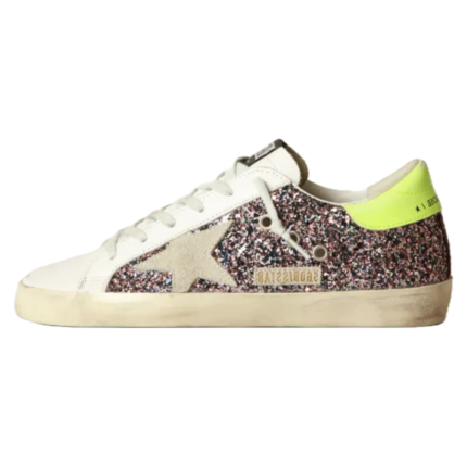 Golden Goose Super-Star sneakers in gray and pink glitter with ice-gray suede star and fluorescent yellow leather