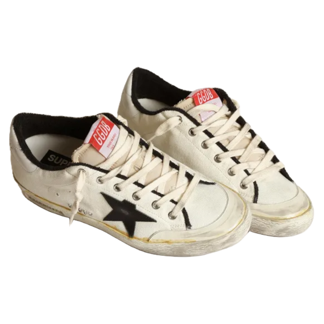 Wees de eerste om “Golden Goose Women’s Super-Star LTD sneakers in beige canvas with black leather star and white leather heel” te beoordelen Reactie annuleren