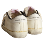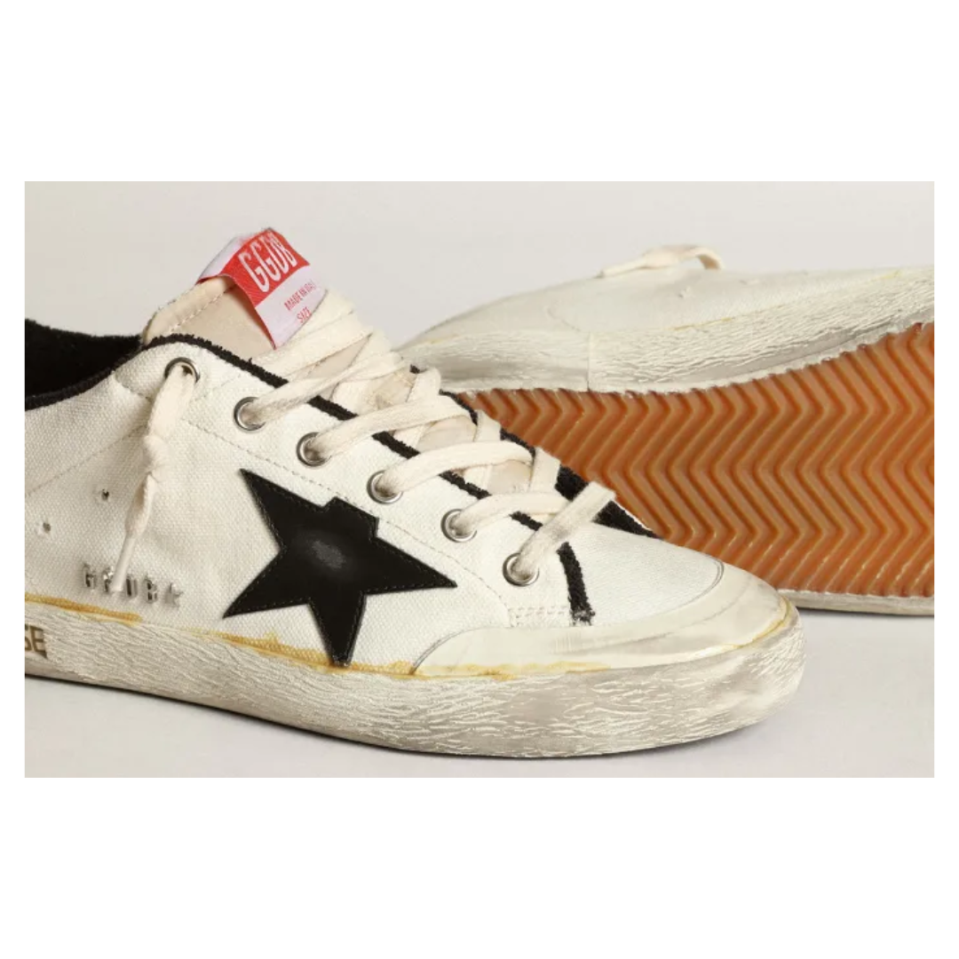 Golden Goose Women’s Super-Star LTD sneakers in beige canvas with black leather star and white leather heel