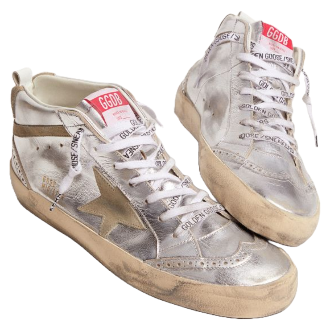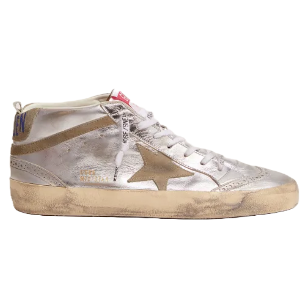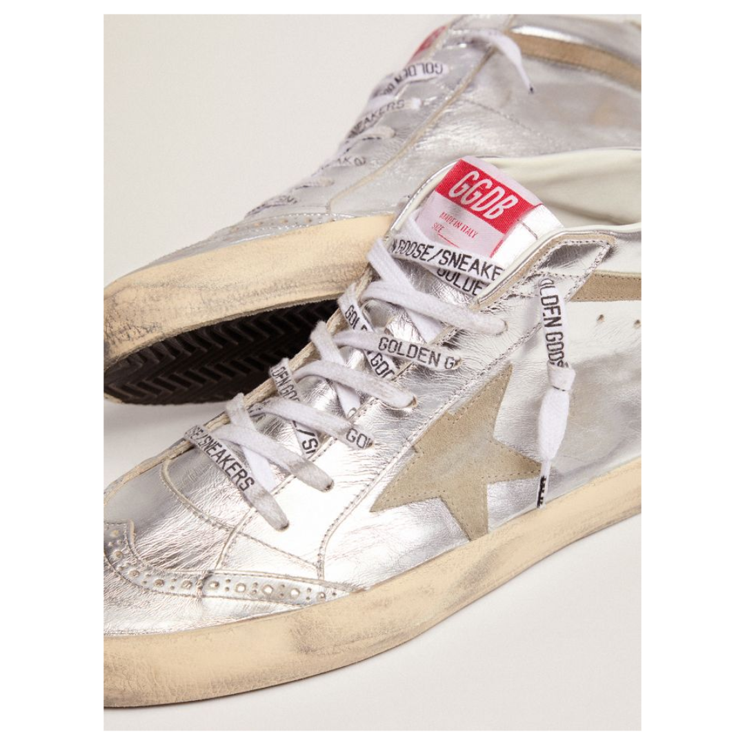 Golden Goose Mid Star sneakers in silver metallic leather with star and flash in dove-gray suede