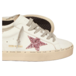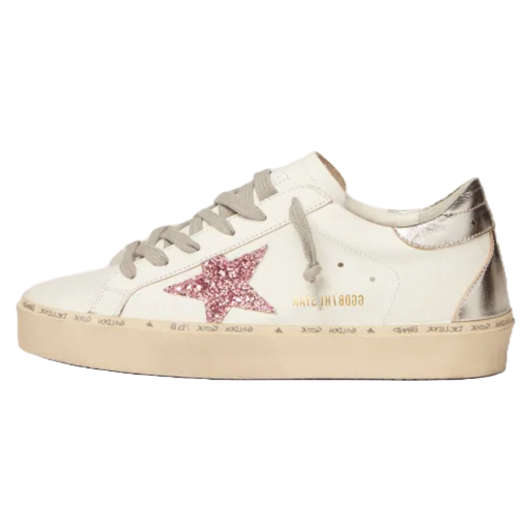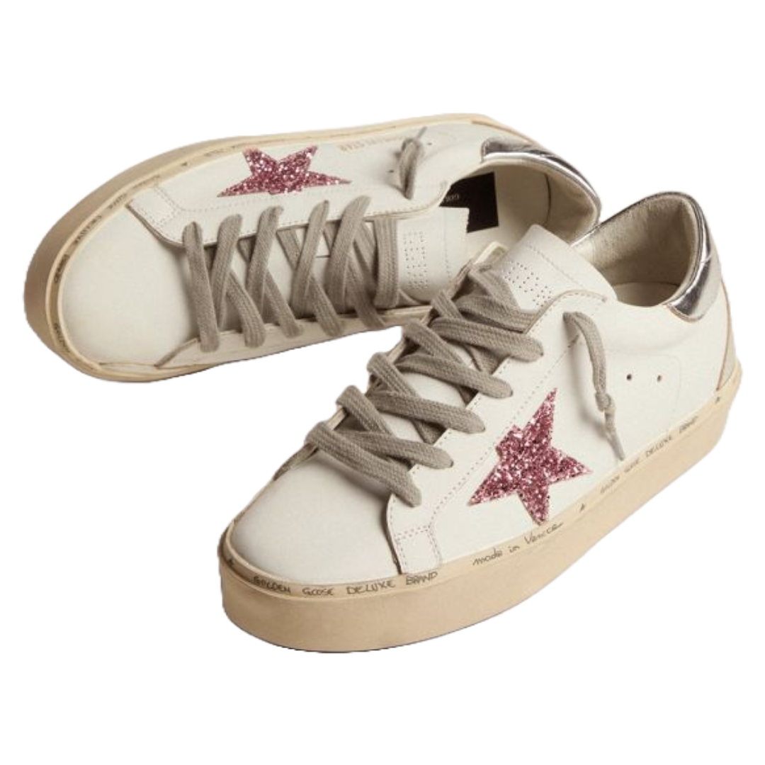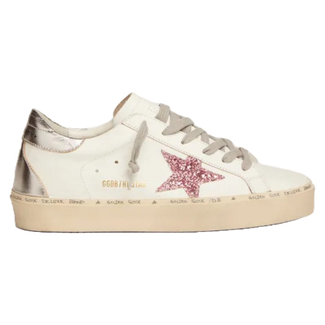 Golden Goose Hi Star sneakers with silver laminated leather heel tab and pink glitter star