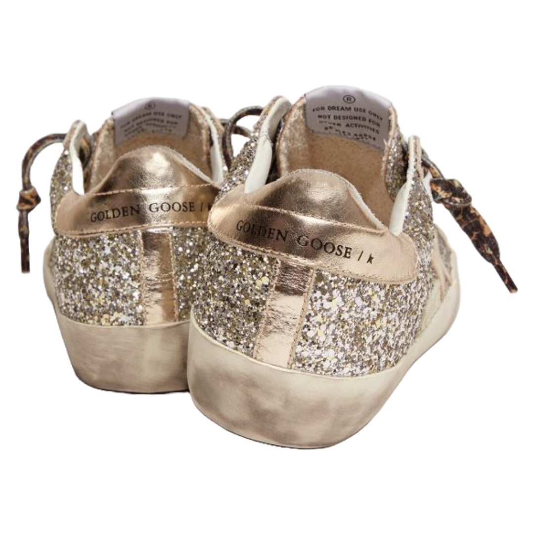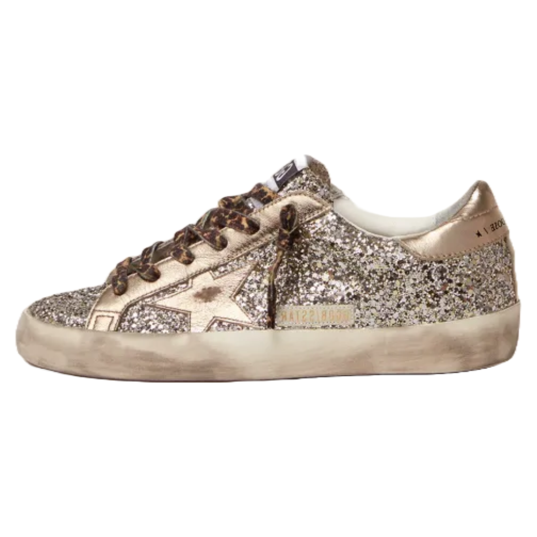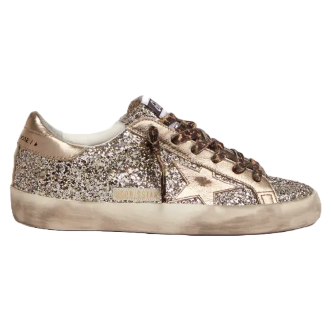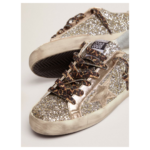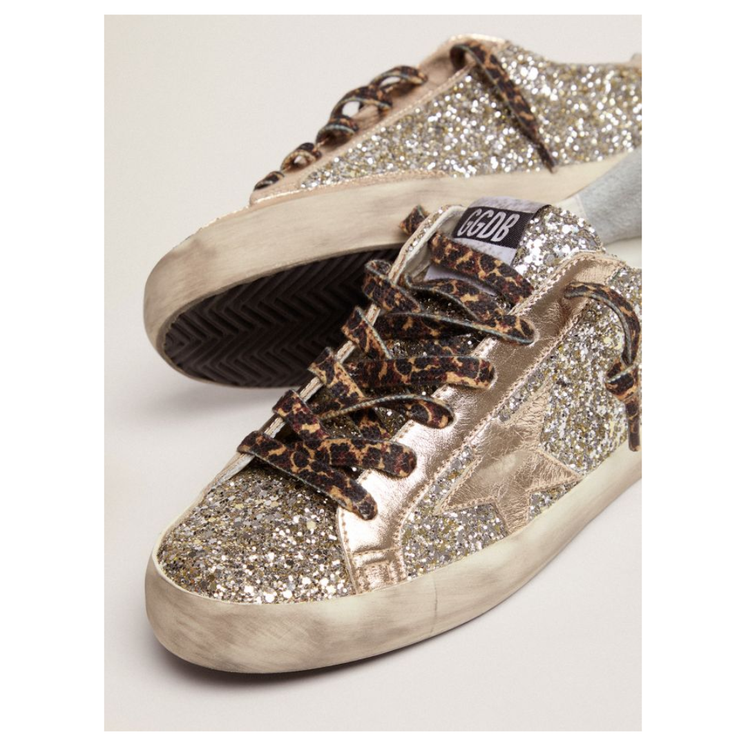 Golden Goose Super-Star sneakers in platinum-colored glitter with star and heel tab in tone-on-tone laminated lea