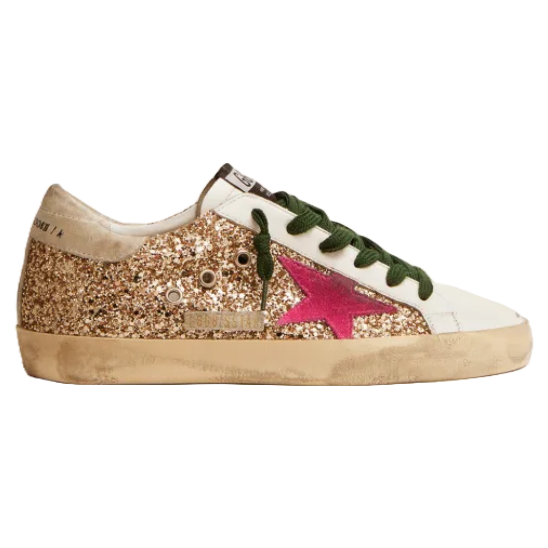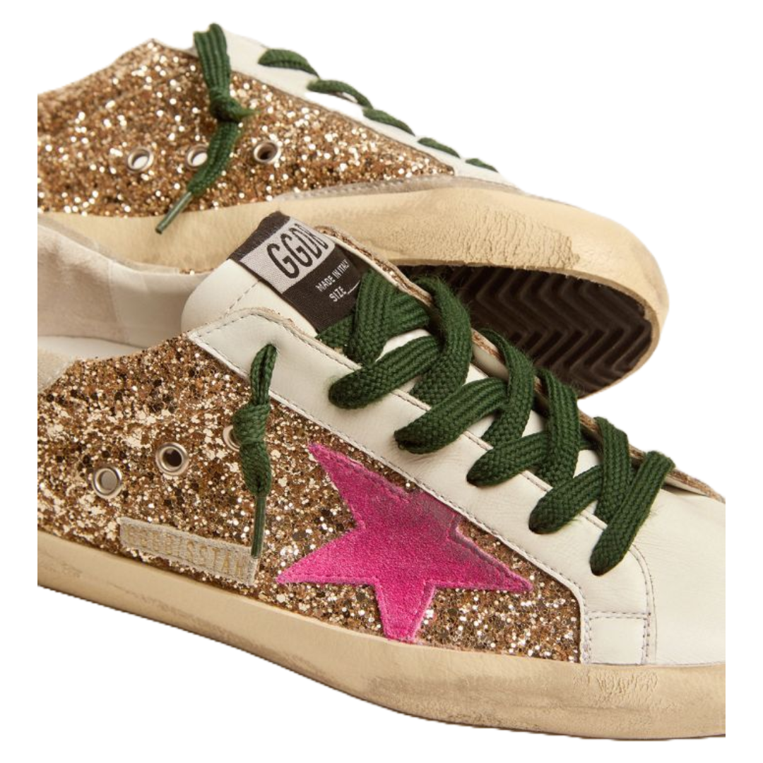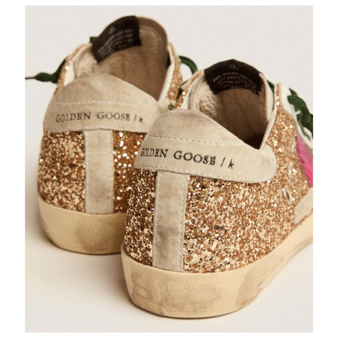 Golden Goose Super-Star sneakers in gold glitter with fluorescent pink suede star