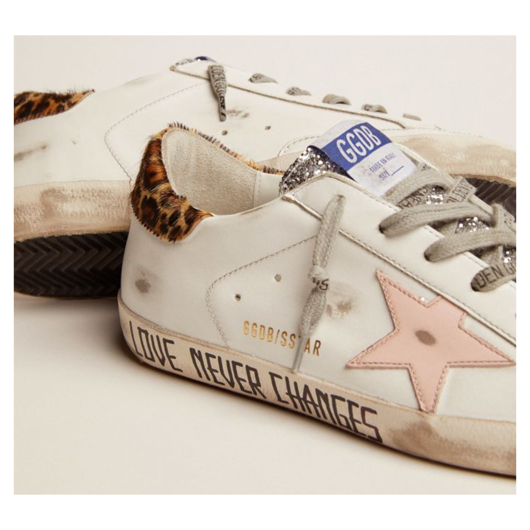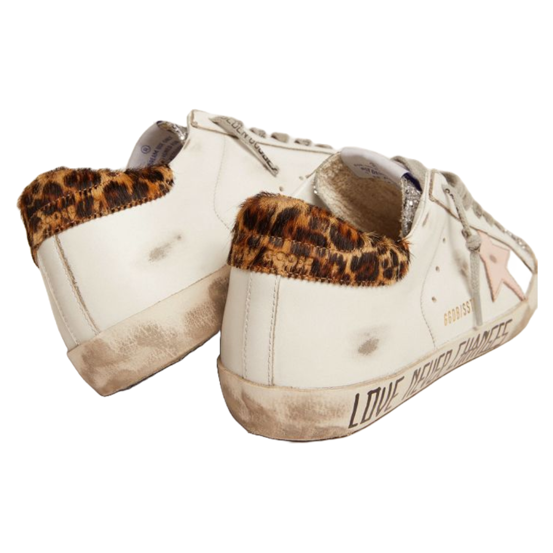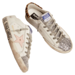 Golden Goose Super-Star sneakers with silver glitter tongue and handwritten lettering on the foxing
