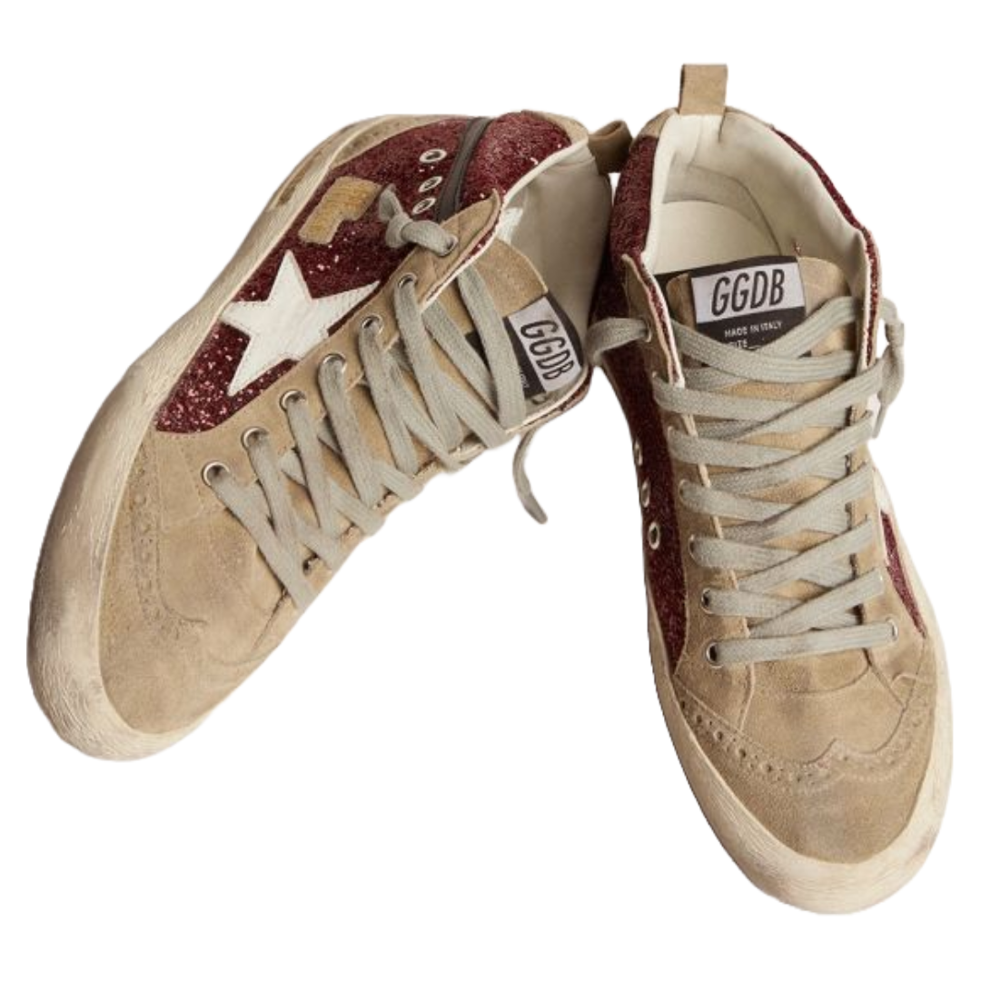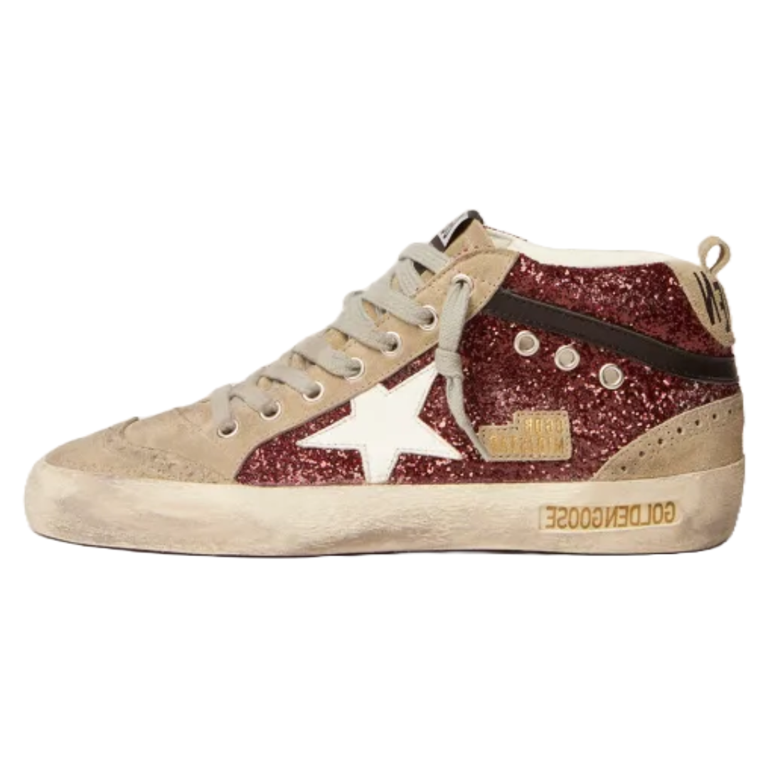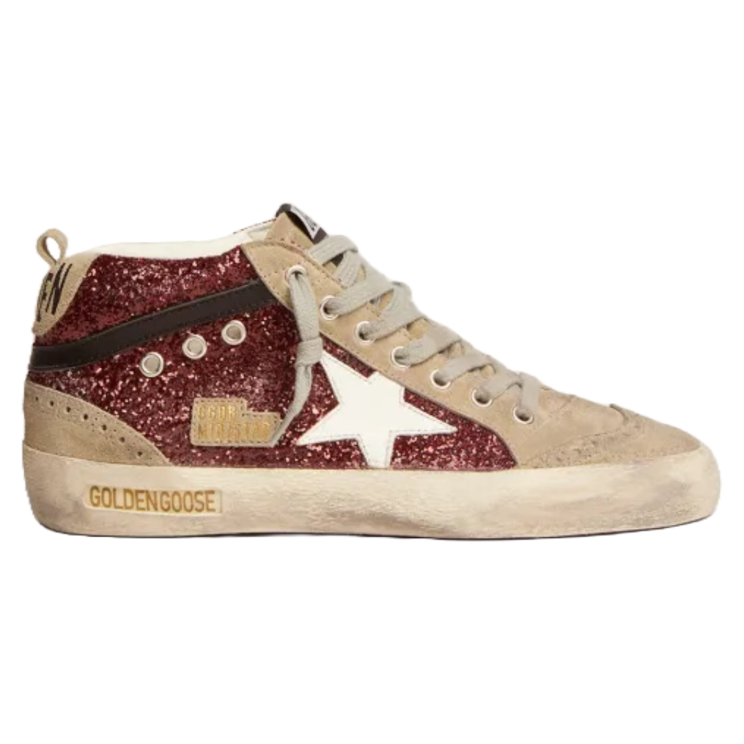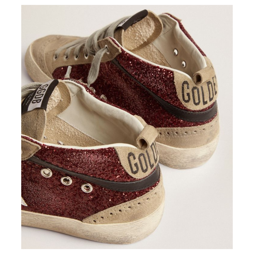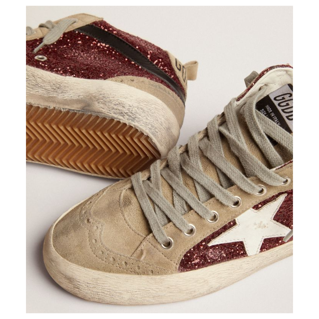 Golden Goose Mid Star sneakers in burgundy glitter with dove-gray suede inserts and white leather star